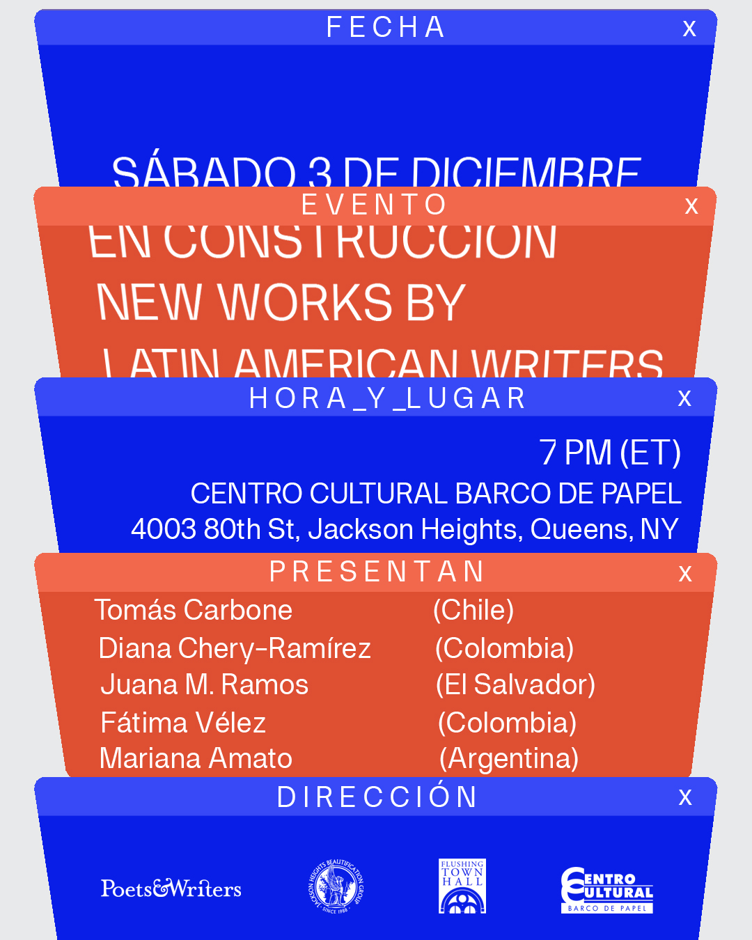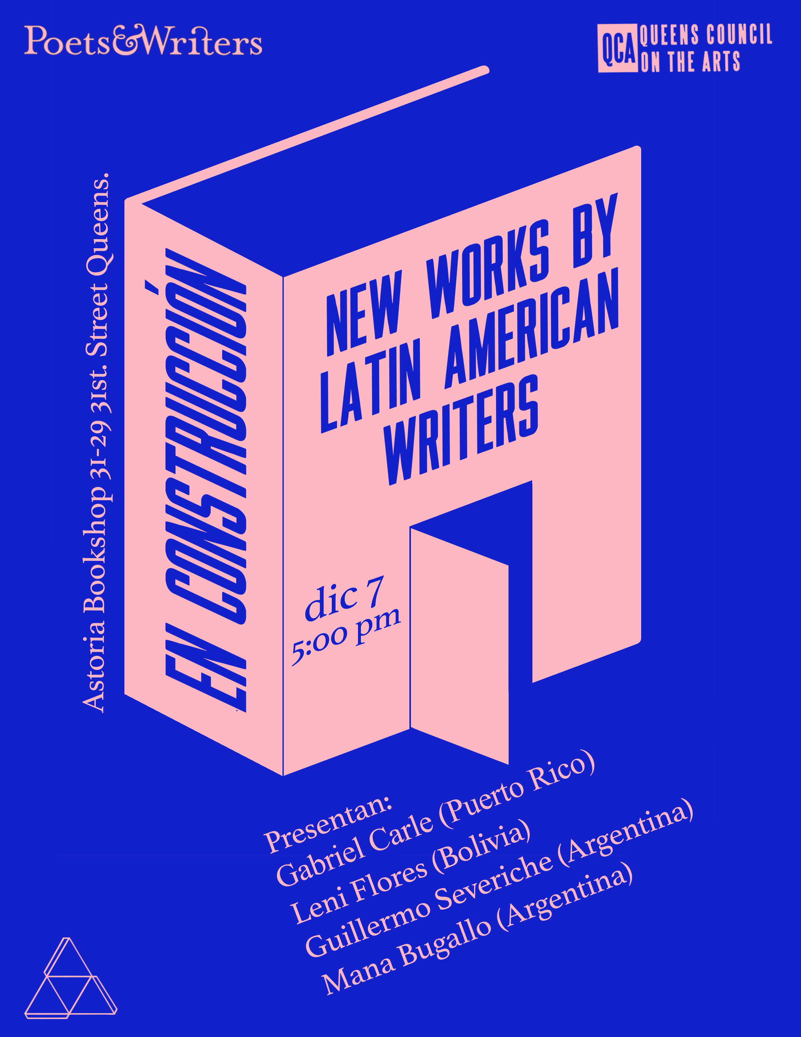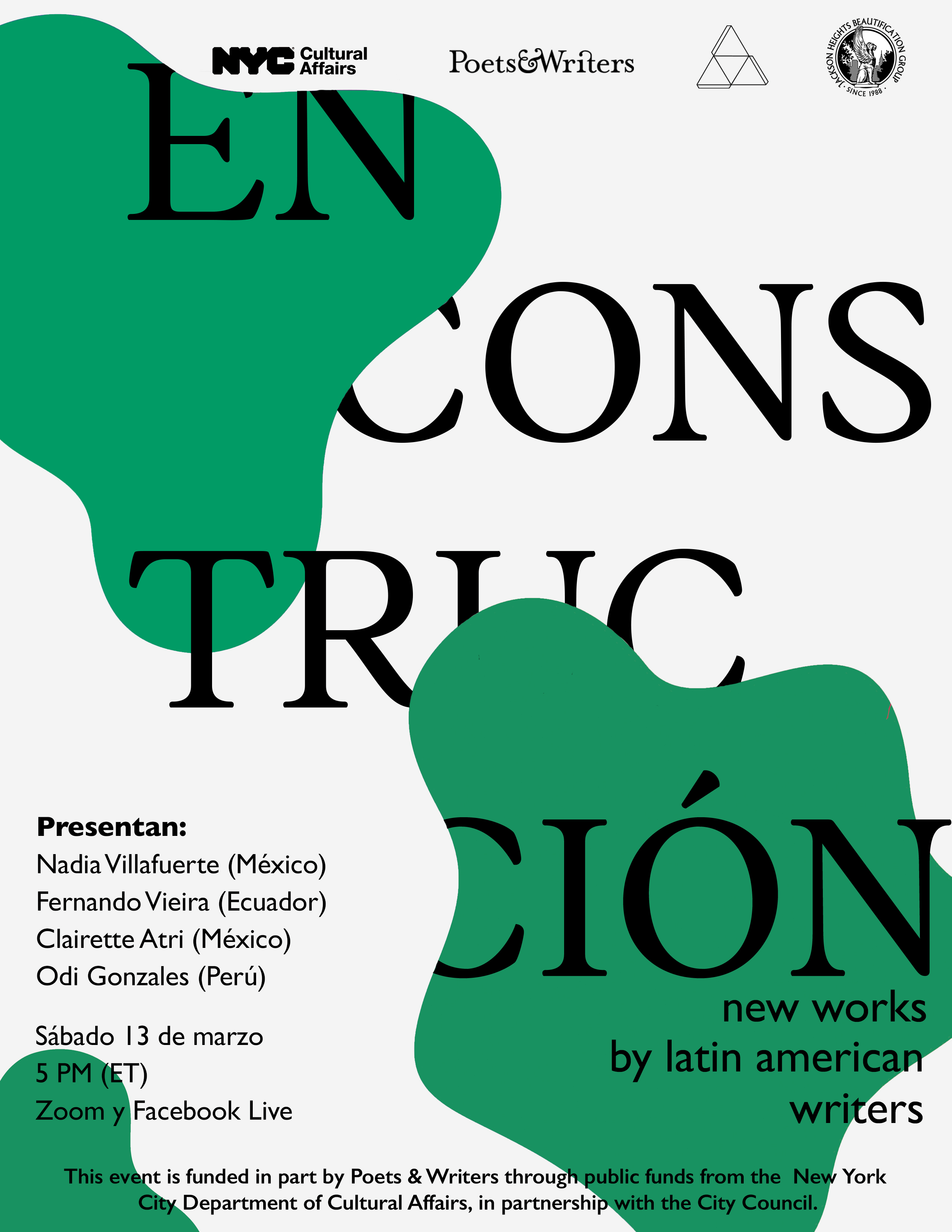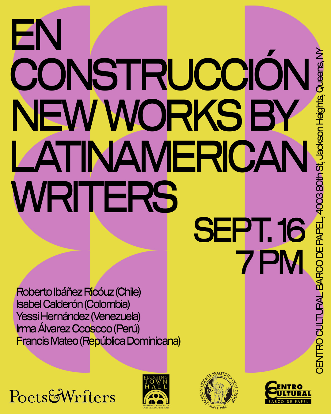 EN CONSTRUCCIÓN is a series of literary readings that offers a creative and collaborative space for New York-based Latinx and Latin American writers. EN CONSTRUCCIÓN provides the opportunity for writers to showcase their work and to establish a professional network in their native languages, primarily Spanish and Portuguese.